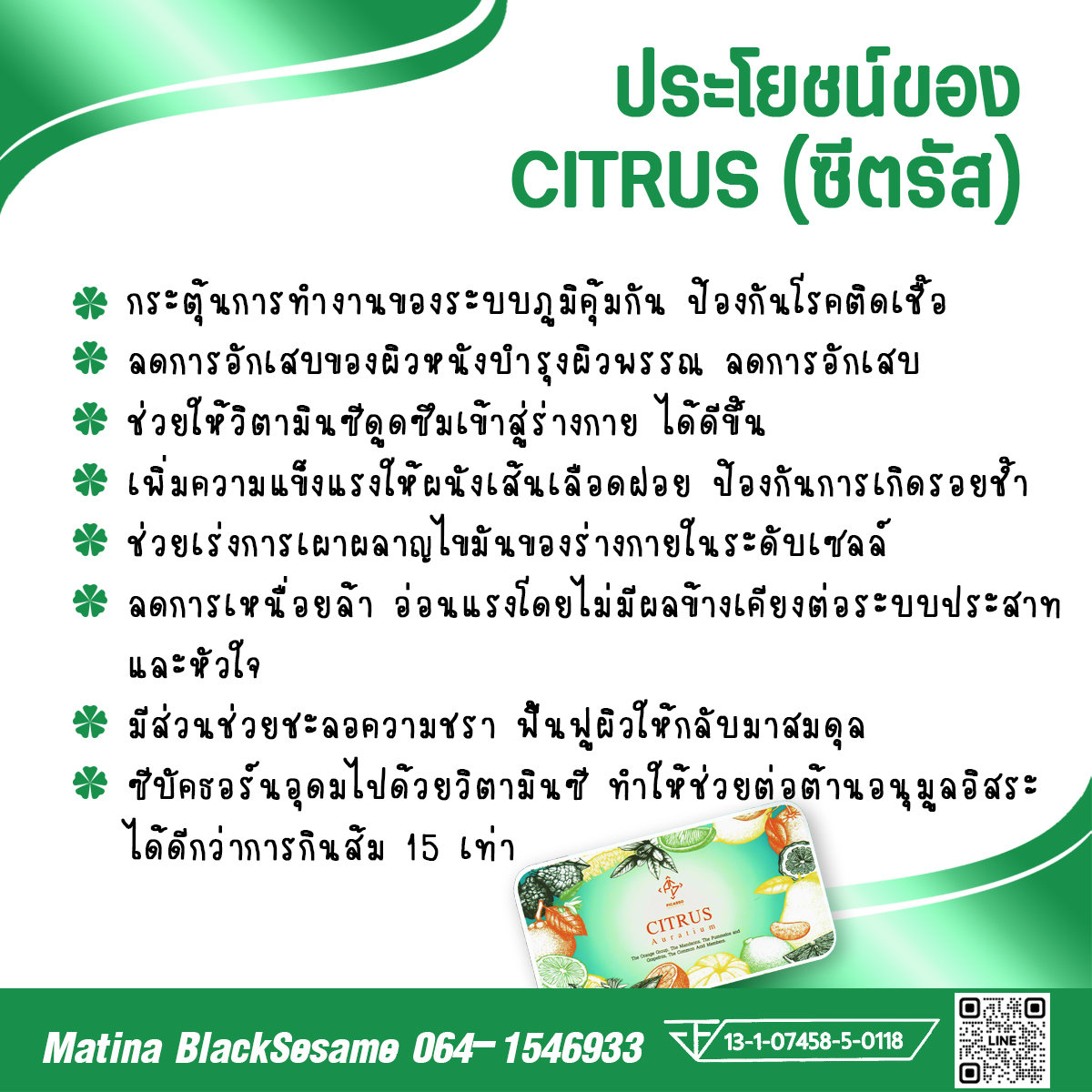 CITRUS (ซิตรัส) อาหารเสริมสกัดจากผลไม้ตระกูลซิตรัสกว่า 100 ชนิด ผลไม้ตระกูลธีตรัส อุดมไปด้วย "วิตามินซี" ที่มนุษย์ไม่สามารถสร้างได้เอง จำเป็นต้องได้รับจากการทานเข้าไป มีหน้าที่หลักๆ เป็นสารต้านอนุมูลอิสระ ซึ่งเกิดจากขบวนการสันดาปในร่างกายหรือจากมลหิษ สิ่งแวดล้อมรอบตัวเรา และช่วยส่งเสริมการทำงานของระบบภูมิคุ้มกัน กระตุ้นระบบภูมิคุ้มกันให้สามารถสร้างเซลล์เม็ดเลือดขาวได้เป็นปกติ ทำให้ร่างกายต่อสู้กับเชื้อโรคต่างๆ ได้อย่างมีประสิทธิภาพ