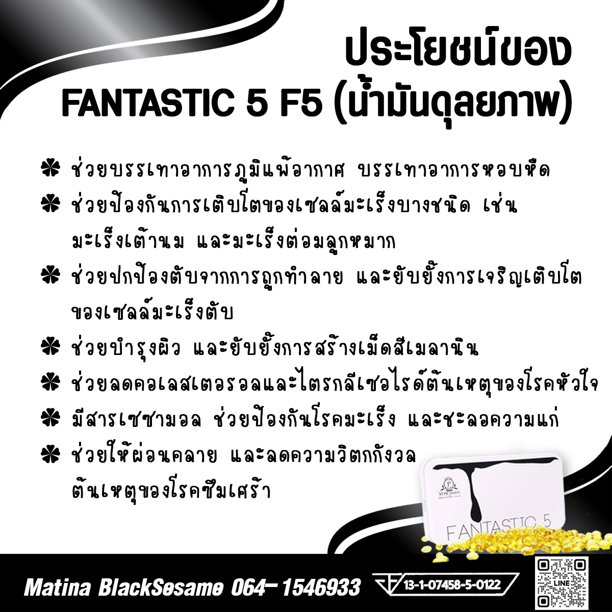 FANTASTIC 5 F5 (น้ำมันดุลยภาพ) (แฟนทาสติก ออยล์) แฟนทาสติก ออยล์ เป็นการรวมน้ำมันเพื่อสุขภาพ 5 ขนิด ในอัตราส่วนที่เหมาะสม เพื่อผลดีต่อสุขภาพ เป็นการรวมพลังสร้างเสริมให้คุณมีสุขภาพที่ดีกว่า น้ำมันสกัดจากธรรมชาติ 5 ชนิด พิชิตความอ่อนเพลียจากการพักผ่อนไม่เพียงพอ ชะลอความเสื่อมสภาพของร่างกายและอวัยวะ ซ่อมแซมส่วนที่สึกหรอจากการผ่าตัดและปัญหาด้านสุขภาพ ป้องกันดีกว่ารักษา เหมือนมีทีมแพทย์เป็นที่ปรึกษาข้างกาย